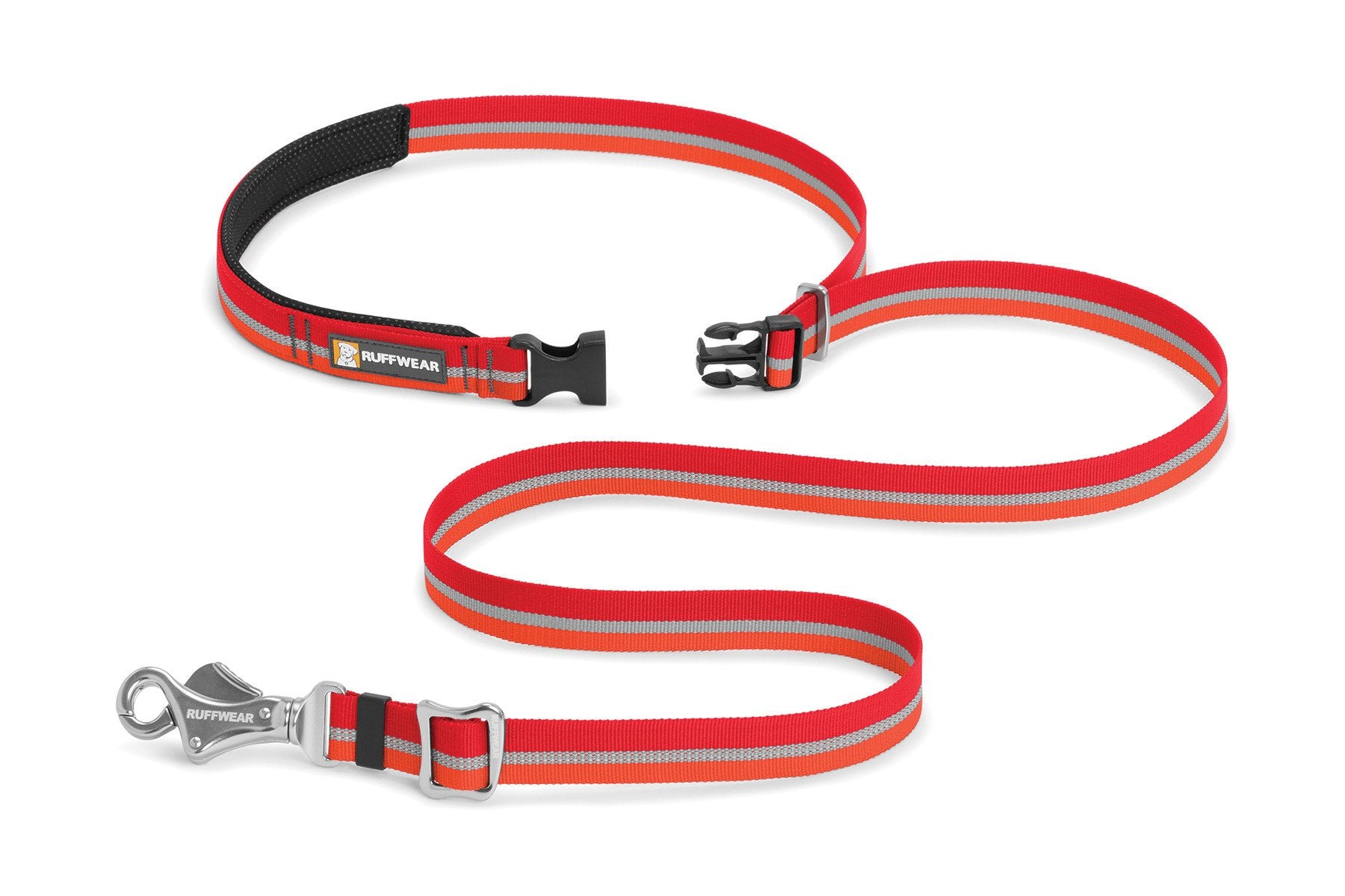 The Ruffwear Slackline Leash is an adjustable-length leash that can be hand-held or waist-worn. The 6 to 3.5-foot (1.8 to 1.1 m) adjustable length can be fully extended for relaxed walks, or shortened for more control as needed. An ergonomic metal slider allows for easy one-handed length adjustment on the go.